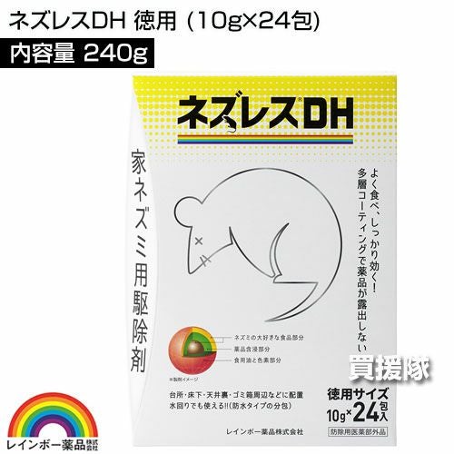 他の画像を見る 【送料無料】水回りでも使える防水タイプの分包ネズミ駆除剤 レインボー薬品 ネズレスDH 徳用 (10g×24包)×80個 買援隊 特別価格 ¥ 48,719 税込 カートに入れる お気に入りに登録する