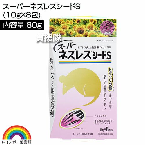 他の画像を見る 【送料無料】ヒマワリの種を使った、食いつきのよい殺鼠剤です レインボー薬品 スーパーネズレスシードS (10g×8包)×80個 買援隊 特別価格 ¥ 48,000 税込 カートに入れる お気に入りに登録する