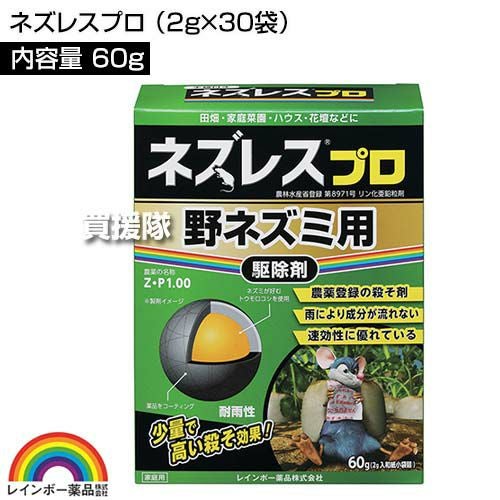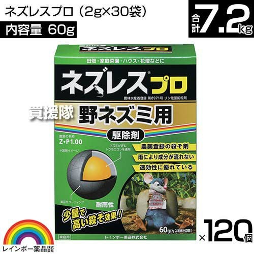 他の画像を見る 【送料無料】少量でよく効き、速効性に優れています。 レインボー薬品 ネズレスプロ 60g(2g×30袋)×120個 買援隊 特別価格 ¥ 67,280 税込 カートに入れる お気に入りに登録する