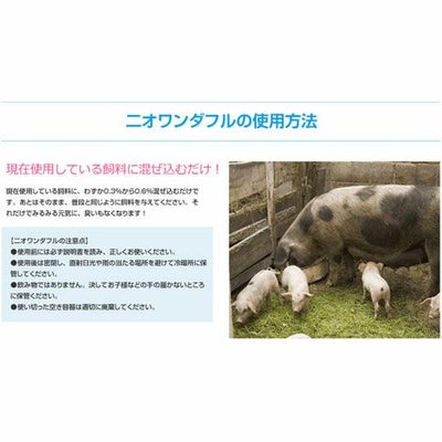 現在使用している飼料に、わずか0.3%から0.6%混ぜ込むだけです。あとはそのまま、普段と同じように飼料を与えてください。それだけでみるみる元気に、臭いもなくなります!