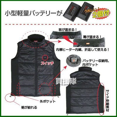 【暖】あったか~い至福の着心地 ●小型軽量バッテリーがうれしい2個付き! ●赤外線効果 体の芯から温まる! ●カーボンファイバーヒーター内蔵 ●内襟ヒーター内蔵、折り返して使える!首が温まる!肩が温まる! ●バッテリー収納用、内ポケット ●サイド伸縮素材 ●裾が絞れる ●両サイドに外ポケット