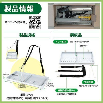 - 機能(本体)排水穴、苗ポート滑り止仕切り、(連結支持台)紐ズレ防止クリップ、(三角錐肩紐)体型に合わせて調節可能