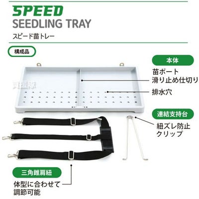 - 機能(本体)排水穴、苗ポート滑り止仕切り、(連結支持台)紐ズレ防止クリップ、(三角錐肩紐)体型に合わせて調節可能