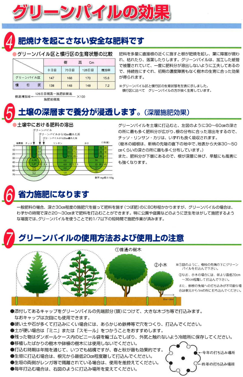 グリーンパイルは、樹木に有効な化学肥料を紙管に溶融充填し、簡単に、深層まで施肥できるよう開発された「樹木専用打ち込み肥料」です。