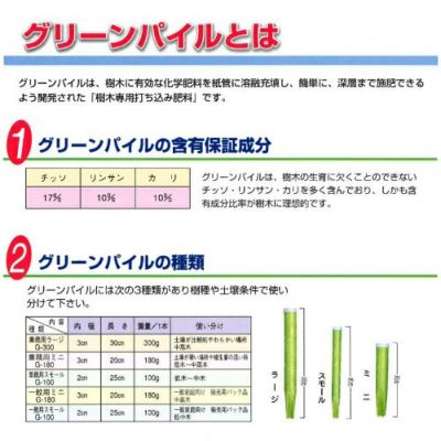 グリーンパイルは、樹木に有効な化学肥料を紙管に溶融充填し、簡単に、深層まで施肥できるよう開発された「樹木専用打ち込み肥料」です。