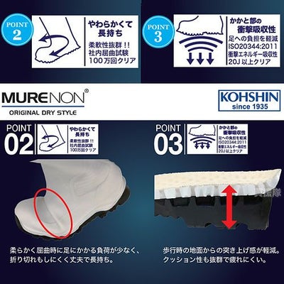 靴内のムレを軽減! 空洞中底&メッシュ中敷 底面に空洞部分を設置し、汗や湿気を落とし込み歩くたびに靴内の空気の循環が促され、靴内のムレを軽減。