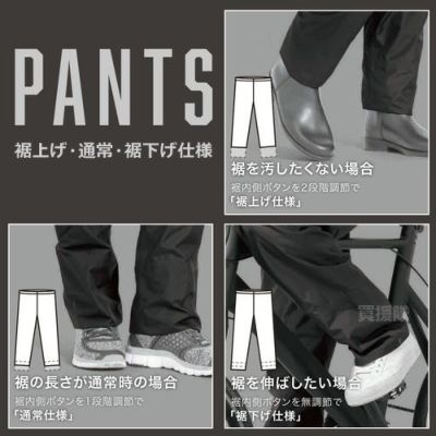 - 特長長つば構造、背中ベンチレーション、ワイド再帰性反射、フードの中に収納可能、ズボン裾上げ・通常・裾下げ仕様、防水・透湿・撥水・防風・防塵、マットな質感でしなやかな素材、縫い目の裏側は防水テープ加工