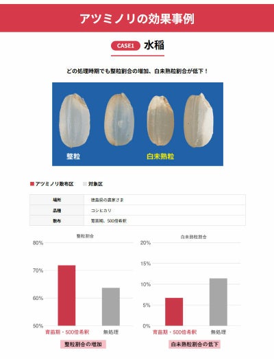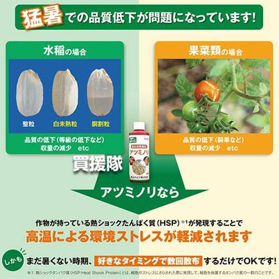 アツミノリは、暑くなる前に作物に散布することで、高温期に作物が持っている熱ショックタンパク質(HSP)※1の発現が促され、高温による環境ストレスが軽減され