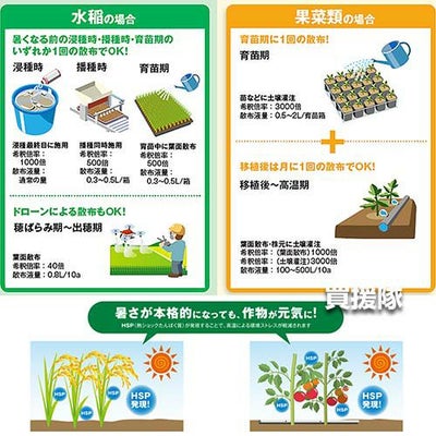 【暑さ対策資材 元気サプリ 低コスト 作物がストレスに強く 水稲 果菜類 育苗 浸種 播種 猛暑 品質低下 対策 散布 希釈 経済的 原液 水でうすめてまくだけ 希釈タイプ】