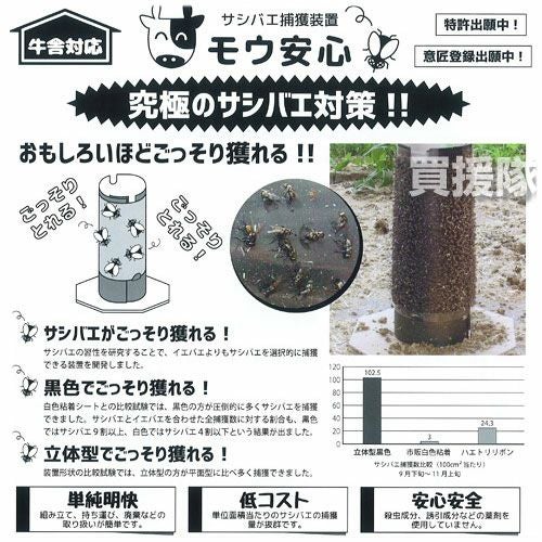 他の画像を見る 【送料無料】牛舎対応、究極のサシバエ対策!! サンパック 牛舎対応サシバエ捕獲装置 モウ安心[トライアルパック](粘着シート10枚/円筒・台座1枚) 買援隊 特別価格 ¥ 7,600 税込 カートに入れる お気に入りに登録する