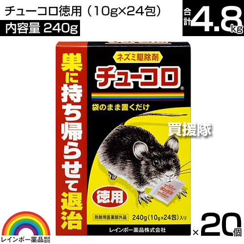 他の画像を見る 【送料無料】そのまま置くだけ簡単に使える殺そ剤です レインボー薬品 チューコロ徳用 240g(10g×24包)×20個 買援隊 特別価格 ¥ 16,200 税込 カートに入れる お気に入りに登録する