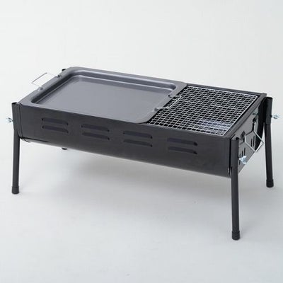 サイズ:使用時/約幅700×奥行325×高さ300・700mm、収納時/約幅700×奥行325×高さ160mm 本体重量:7.0kg 材質:本体/鉄(電着塗装)、網・ロストル/鉄(クロームメッキ)、脚/鉄(粉体塗装)、鉄板/鉄(シリコン樹脂塗装) 付属品:焼網(29×38cm)、プレート(29×23.5cm) 適用人数:6~7人 原産国:中国
