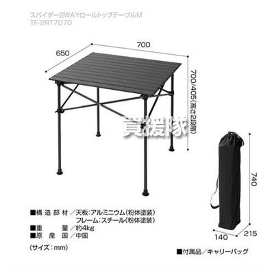 今年から展開する、重厚さとリラックスを融合した新シリーズ。高さが2段階に調整できる「スパイダー2WAYロールトップテーブル」。Mサイズ(幅650mm)。スパイダーロック仕様で天板が外れにくい。コンパクトに収納可能。