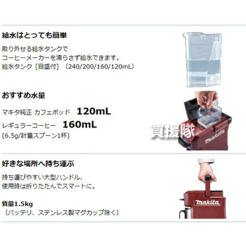他の画像を見る 【送料無料】マキタ 充電式 コーヒーメーカー 青 マキタ 充電式 コーヒーメーカー 青 [本体のみ/バッテリ・充電器別売] CM501DZ 買援隊 特別価格 ¥ 14,100 税込 詳細を見る お気に入りに登録する