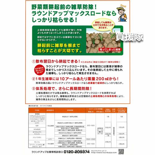 他の画像を見る 【送料無料】日産化学 ラウンドアップ 2L マックスロード AL 【8本セット(1ケース) 合計16L】日産化学 ラウンドアップ 2L マックスロード AL シャワータイプ 買援隊 特別価格 ¥ 11,110 税込 カートに入れる お気に入りに登録する