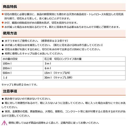 他の画像を見る 【送料無料】住友化学園芸 花工場 切花ロングライフ液 住友化学園芸 花工場 切花ロングライフ液 480ml×30本 買援隊 特別価格 ¥ 14,800 税込 カートに入れる お気に入りに登録する