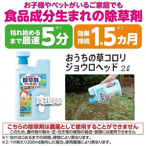 他の画像を見る 【送料無料】アース製薬 おうちの草コロリ ジョウロヘッド アース製薬 除草剤 おうちの草コロリ ジョウロヘッド 2L×4本 買援隊 特別価格 ¥ 4,600 税込 カートに入れる お気に入りに登録する